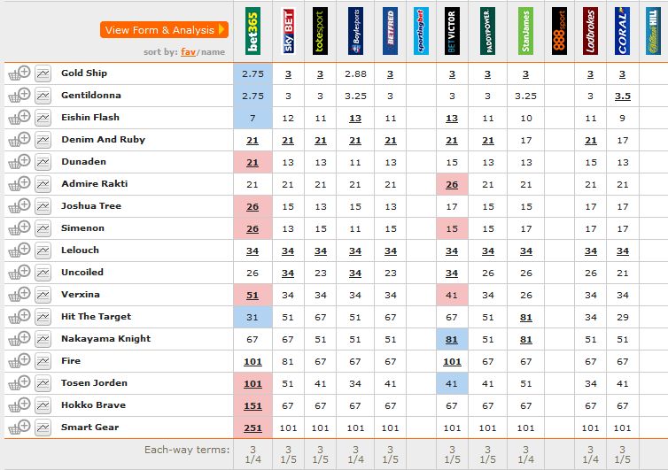 外國莊家一致看好「黃金船」,幾乎所有莊家開出3倍賠率,次熱門為「貴婦人」也只是比「黃金船」較冷,「榮進閃耀」放在第三熱門。接著是三匹外隊馬,然後是「愛發達」以及「有型露比」這些在一級賽有根據的馬匹。再數下去是「利祿殊」。