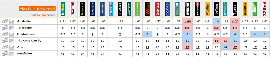 5.「翠鳥」(Kingfisher)、1檔:在葉森打吡表現只是一般。在愛爾蘭打吡,作為「澳大利亞」的開路馬,結果亦能跑獲第二而回。不過賽事水平受懷疑。