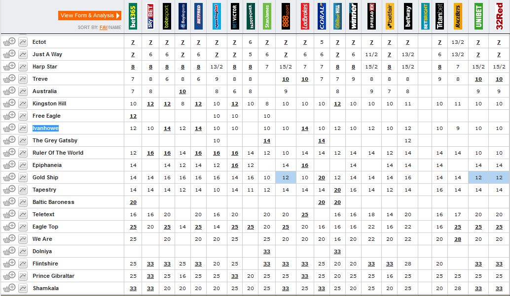 還沒完的,想信除了馬迷外,英國莊家亦很緊張,因為許多馬匹的賠率需要進行調整。現在就看看星期一的賠率表。大熱門變了保持不敗的Avenir Certain以及在約克橡樹大賽僅敗的Taghrooda,開出的賠率介乎是5-7倍。Ectot克服路程問題成為第三熱門,至於在紅寶錦標跑第四的「卓芙」(Treve)降至9倍左右。而兩匹日本馬「一路通」(Just A Way、ジャスタウェイ)以及Harp Star(ハープスター)亦進入10倍範圍以內。「澳大利亞」(Australia)是否角逐仍然成疑。再之後的馬匹還有「京士頓山」(Kingston Hill)以及Ivanhowe,前者剛大熱勝出聖烈治錦標,後者在巴登大賽擊敗Sea the Moon。