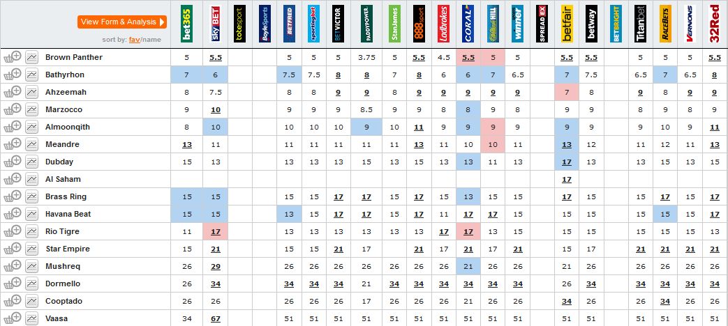 說一下此賽事的盤口,大熱門是「啡豹」,不過不熱得過份,「百力康」為次熱門,10倍以內還有「傲勝馬」(Ahzeemah)以及「紋章獅子」(Marzocco),「致富良機」(Brass Ring)以及「古巴節奏」(Havana Beat)也獲得支持,此賽事也已排位。「啡豹」及「傲勝馬」分別在14及15檔起步,但不用擔心,與墨爾本盃相似,因為是長直路,還有很長時間調整馬匹走位。「百力康」在第8檔起步。