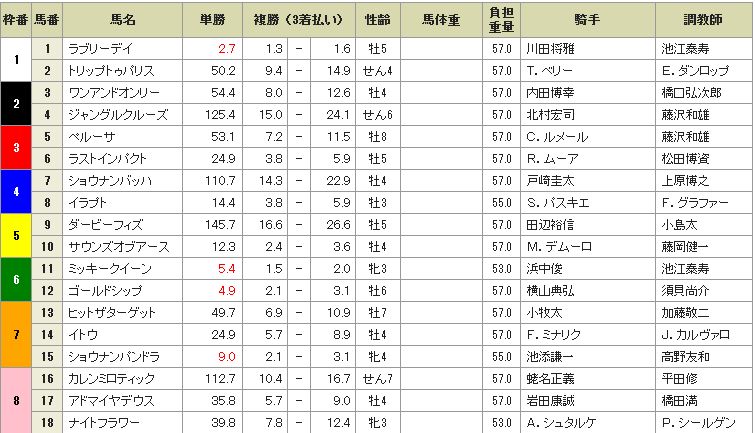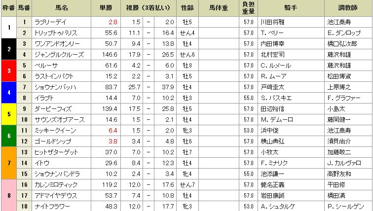 1.「朗日清天」(Lovely Day、ラブリーデイ):今年八場賽事六場勝利,除了兩場在距離較長賽事(均為3000米或以上賽事)失利下,其他均告捷。初時並不看好,但在秋季已經成為了賽事的爭標主角,上場因停賽關係,改配濱中俊,並順利大熱贏馬,今戰將用回川田將雅。2400米距離不是問題,過往也在東京優駿跑獲第五。數據上也有內欄跑