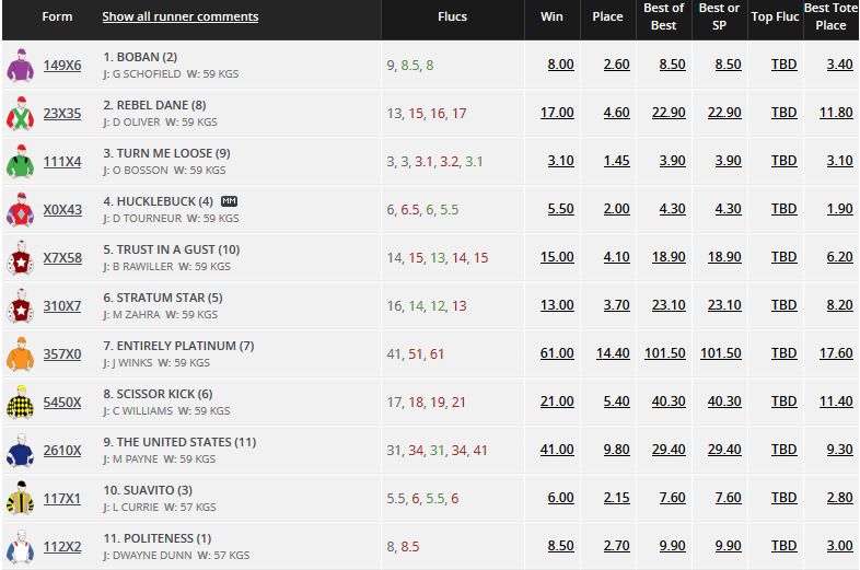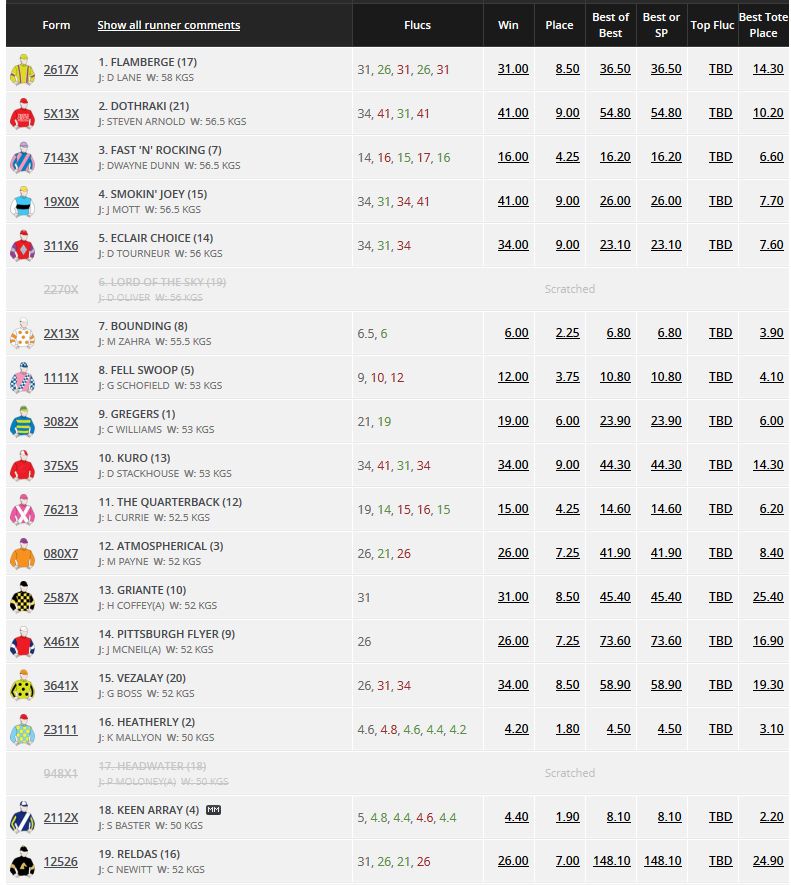 5.「拜託勁風」(Trust In A Gust)、10檔:此駒最旺盛的時候是前年9月及10月,贏出兩場讓磅一級賽,但之後因傷再沒出陣。此後復出進度仍然斷斷續續,在上場只能在柯爾錦標只能跑第八名。看來在平磅賽中還是需要更大的努力才能回復應有的水平。
