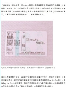 今次的主角是AV女優明日花綺羅羅,除了成人事業外,另一項大人才能玩的買馬也得手,她用了2030萬日圓,在目黑紀念賽買入「成名遊戲」(Fame Game、フェイムゲーム)獨贏,最終以19倍冷門贏馬,派獲382573萬日圓,這樣贏已經夠狂。但是為何傳到中文傳媒上卻出錯了什麼。我們先看中時電子報的版本。