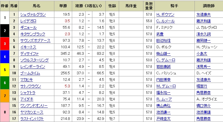 「北部玄駒」贏完秋季天皇賞後,又能否在日本盃高開,不過「金之霸」將會是牠的問大威脅。分別成1.8倍及2.8倍的熱。然後是9倍的「里見皇冠」,會否就此高開?然後就到「豐收節」,到底牠的狀態是否如之前回勇。至於「觸動心弦」的賠率亦與「豐收節」相當之後。其後的「高尚駿逸」也有38倍。至於外圍賠率「北部玄駒」接近3倍。「金之霸」就有4倍支持,外國馬就算最熱的「愛達荷州」亦只有20倍。