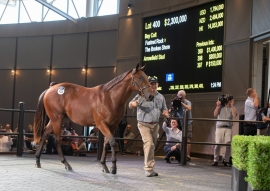 接著到268號雄馬隆重登場,父系「燈塔島」,母系O’Marilyn,此駒叔父Headturner曾經贏出澳洲打吡,但是馬匹亦同時被古摩亞盯中,最後當摩亞賽馬舉牌到180萬澳元時,對方放棄。喬治摩亞直指是整個拍賣會當中最好的一匹。接著下仍然有100萬。剛剛在一級賽開齋的「比亞路」(Pierro)子嗣亦有好消息。291號雄馬,半兄「有根有據」(Inference)贏出蘭域堅尼。母系本身亦取下兩勝。以105萬由Hermitage Thoroughbreds等人投得。