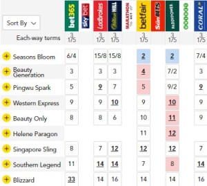 「四季旺」今季表現最穩的馬匹,香港一哩錦標之敗有理由,因而成為大熱門。「美麗傳承」則成次熱門。其他馬匹賠率差不多,當中「平湖之星」及「西方快車」有不錯支持。但是「星洲司令」以及「川河尊駒」支持度不高。「有得威」其中一名莊家開出34倍,但亦有17倍支持。