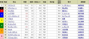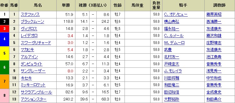 1.「善德福」(Staphanos、ステファノス):出賽經驗豐富,雖然自2014年10月以來再未有頭馬進帳,但是不能忽視存在,壓線能不不錯,總會把握勝利。今年復出後狀態漸漸回復,上戰每日王冠只輸一個半馬位。今場賽事由愛爾蘭騎師歐道樂策騎。