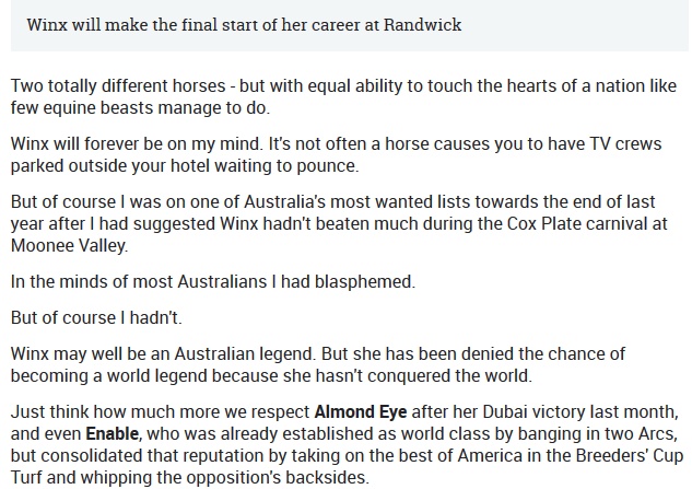去年10月,英國馬評家Matt Chapman指,「拼百圖」(Benbatl)可以將之擊敗。今年1月,指「雲絲仙子」(Winx)國際評分不應太高。結果這兩個都是幹話。