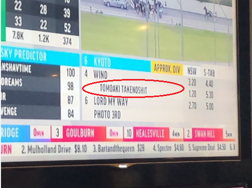 星期日澳洲轉播日本賽馬,其中竹之下智昭在京都第六場憑Wind(ウインド)贏出500萬條件賽。不過在澳洲轉播時