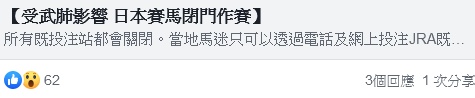 馬圈的還有更厲害。因為正值「病毒蔓延時」,日本中央競馬會宣佈「無觀眾賽馬」,即使馬主入場亦受限制。