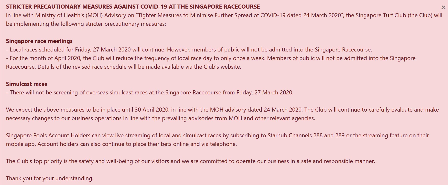 隨著新加坡政府採取近乎鎖國的政策,公眾不能集會。新加坡賽馬公會在首頁公告指出。不會在馬場內轉播任何賽事,賽馬將會以無觀眾方式舉行,每星期只舉辦一個賽日,這個政策將維持4月30日為止。
