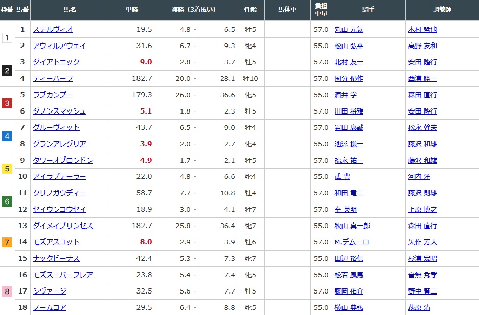 13.「大名妃子」(Daimei Princess、ダイメイプリンセス):去年8月爆冷贏出北九州紀念賽。不過其後表現一般,雖然未致於大敗,但看不到爭標機會。