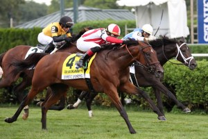 沙拉托加週六日舉行沙拉托加打吡及沙拉托加橡樹的高獎金黑體字賽事。首先是沙拉托加打吡,「皇僕」(Kingman)開始在美國有所影響,早前在賽馬殿堂錦標只獲季軍的Domestic Spending,由草地練馬師專家白偉賢訓練,並從後頂著Gufo追上,結果險勝而回。