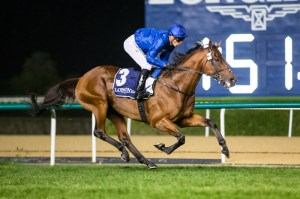 至於「范高爾」(Frankel)子嗣Hurricane Lane在一哩的初級賽從後追上,以兩個馬位Parachute等馬。