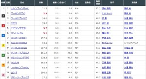 沒那麼極端了。最少這個賠率差是去年有馬紀念賽差不多的水平。不過幸目仍然以2.3倍成為大熱門。其後就3倍「鐵鳥翱天」,「謀勇兼備」亦有3.4倍。「耀滿瓶」憑著京都大賞典冠軍,以19倍成為第四熱門。接著是21倍的「機伶金花」。再數下去有35倍的「世界首映」以及41倍的「神業」。99倍以內就有「直達巴黎」以及「笑一笑」。