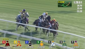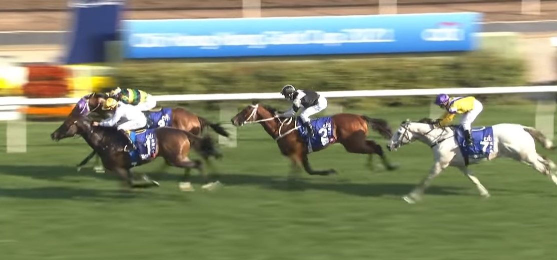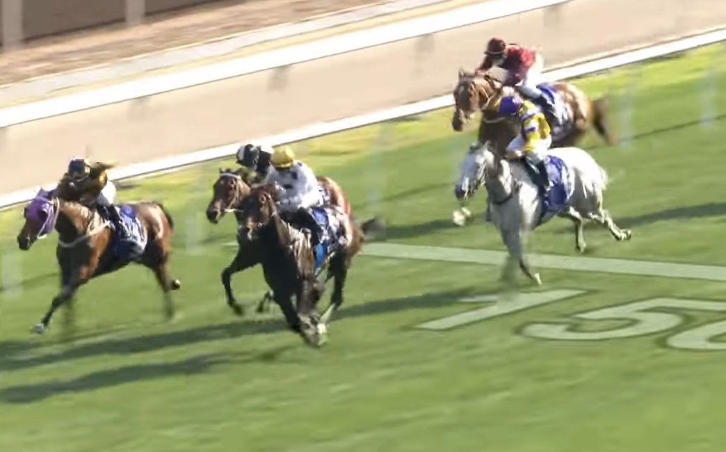 但是「金鎗六十」領先的時候又發作了,慢慢靠著「滿添意」(Furore)的外側內閃。