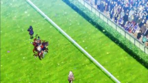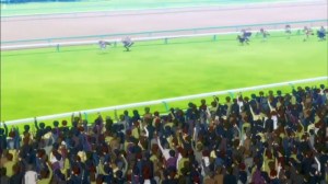 不要忘記「東海帝皇」跑回「目白麥昆」的那麼,在賽馬娘的動畫版,幾乎沒把沙圈顯現出來。在那麼只是看到「目白麥昆」,卻跟現實連半個觀眾也沒有。此外在轉彎時明坂聰美把所有賽馬娘的名字唸一次,這個與以前只提及重點的賽馬娘不同。