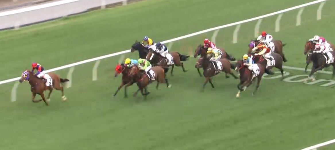 轉入直路後,可以看到1號馬Sounding Bell(サウンディングベル)騎師林幻突然勒避。