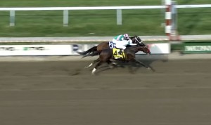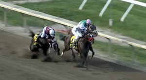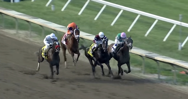 結果Midnight Bourbon在兩馬之間失位之下拋下了騎師,結果Paco Lopez在不需要發揮他的演技之下墮馬