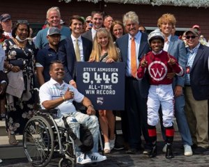 殿堂練馬師艾蒙信,不用等太久打破練馬師紀錄,雖然在四個馬場派馬上陣,但出現在正確馬場。在沙拉托加第五場的處女馬賽,由Tapit子嗣Stellar Tap取下從練9446場勝利。他表示能夠打破紀錄,是上天賜他的一份最佳禮物。