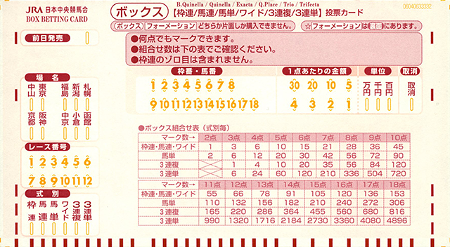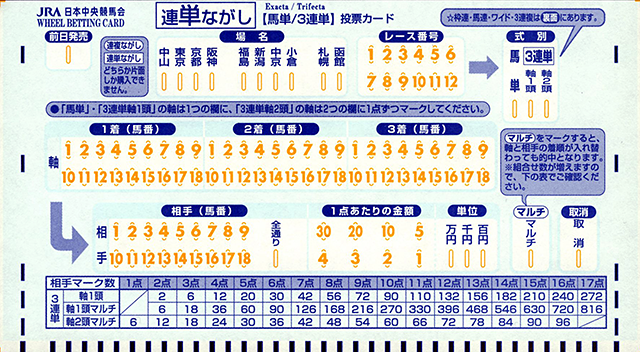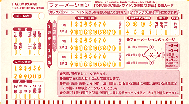 要注意的是日本馬場內以及場外投注處沒有英文彩票,但一般可在出發日本前列印英文說明文件。基本上有中文閱讀能力,可以看懂大部份的彩池說明內容,但有一些則使用平假名,故一併說明。此外亦使用了便於單式投注的彩票,填寫時要留意。