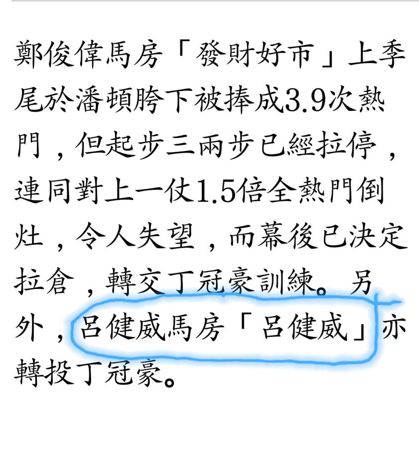而是這位賽馬記者。他說一匹在呂健威房訓練的「呂健威」,將會改由丁冠豪訓練。什麼?有「呂健威」這匹馬,就算如此,馬名都不會批准。