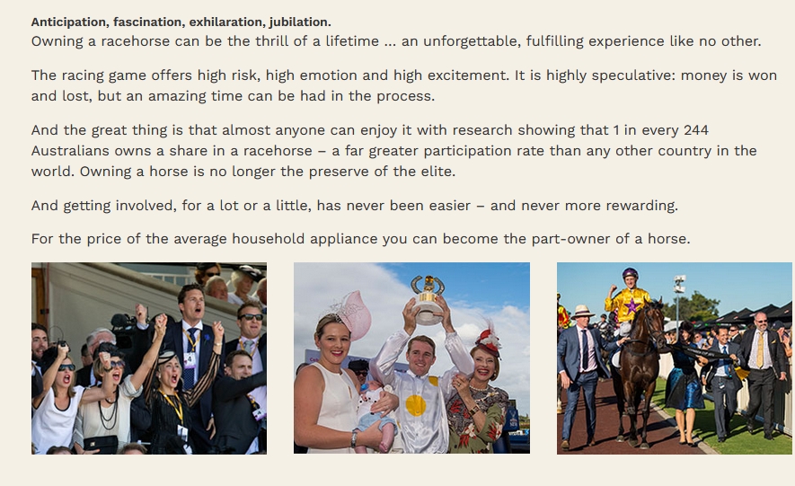 在澳洲,成為馬主的門檻非常低,經常看到澳洲賽馬的宣傳是,每244名澳洲人,就有一人是馬主(aushorse數字)。澳洲馬匹主要由一位練馬師、賽馬集團或馬販提供馬匹。然後根據馬匹佔股比例投資馬匹,例如是2%、4%、10%等,可以減少成本,而且在馬主登記程序完成後,會於馬主名單中顯示你的名字,因此一匹賽駒由一匹大馬主所有,但是馬主之一可能就是「你」。如果有更多成本負擔,亦可以個人名義完全擁有馬匹。唯一缺點的是,如以個人名義投資馬匹,你的名字會被公開,除非參與投資賽馬團體。
