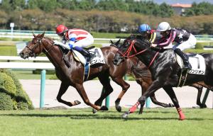 新潟第五場雌馬1600米新馬賽,「神威啟示」(Epiphaneia、エピファネイア)子嗣Grande Regina(グランデレジーナ)跟在第二位下,輕鬆大勝三個半馬位。