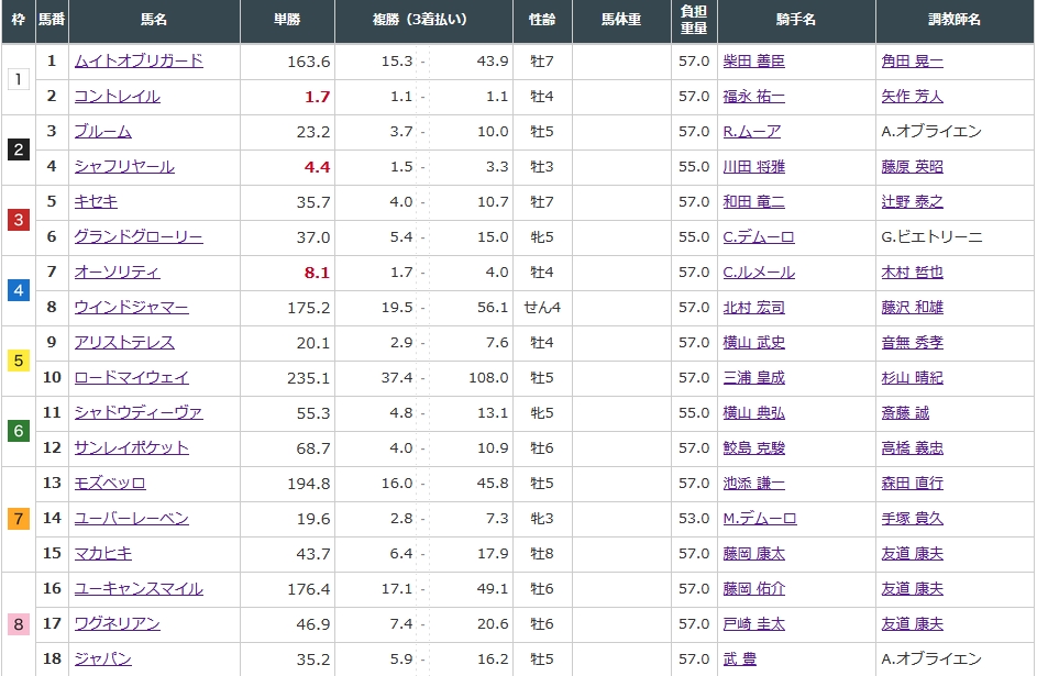 2.「鐵鳥翱天」(Contrail、コントレイル):去年在日本盃中面對三強對決之下跑獲亞軍。今年在大阪盃受天雨影響發揮,秋季天皇賞發力稍為遲了一點,反應稍遲只獲亞軍。今場賽事將是牠的退役戰,雖然三冠後未嚐一勝,但對手實力相當強。今次排在內檔,贏馬機會看起來增加(詳細介紹)