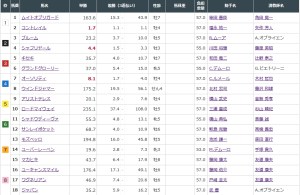 13.「魔族紳士」(Mozu Bello、モズベッロ):擅於天雨角逐賽事,去年寶塚紀念賽跑入季軍以及今年大阪盃跑入第二已為其代表作。不過當馬狀態一低落,表現明顯不濟,就如上戰秋季天皇賞表現全無威脅,一直只能在後方。