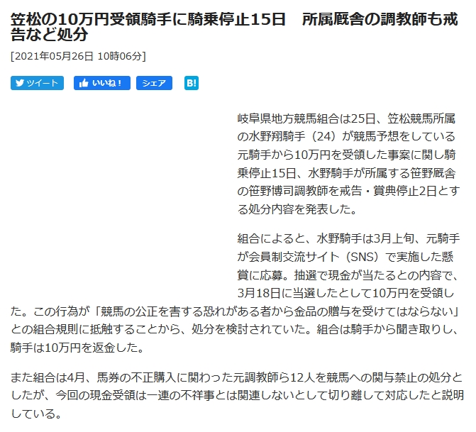 指水野翔3月參加一個社交網站活動,並從活動抽獎中,抽到10萬日圓,不過當悉知違反賽馬規則後,已經將有關金額退還。