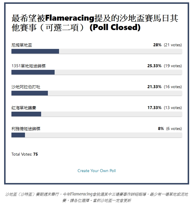 星期六沙地盃(沙特盃)賽期,我們決定挑戰尼姆草地盃、1351草地短途錦標以及沙地阿拉伯打吡。尼姆草地盃最有看頭的馬匹是「致勝一擊」(Pyledriver),去年贏出一級賽加冕盃,香港瓶取下亞軍。日本盃亞軍「威信英明」(Authority、オーソリティ),能不能繼同主馬般擊敗「致勝一擊」。在膠沙地表列賽僅負於「致勝一擊」的「出身名校」(Harrovian)亦有支持。雌馬「倚蓬萊」(Ebaiyra)轉投葛威法馬房。其他黑馬還有三級賽冠軍「堅石」(Solid Stone)以及「海峽貓」(Channel Cat)。