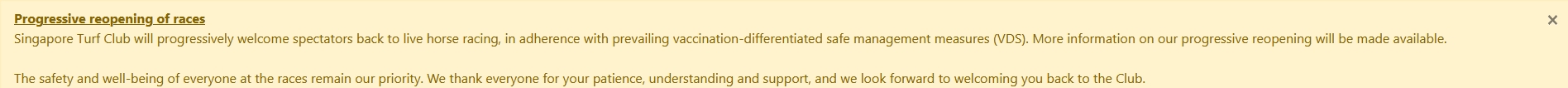 香港可能是最後一個因疫情下無法進場觀賽的馬場。新加坡賽馬會宣佈,將會推出疫苗通行證的系統,有秩序地恢復公眾進入克蘭芝馬場安排。不過馬會並未公佈確實日期。