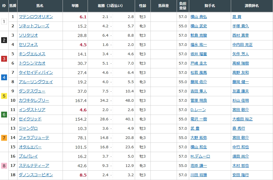 1.「摩天獵戶」(Matenro Orion、マテンロウオリオン):新馬賽跑第二後,兩星期後角逐條件賽反而贏馬,其後再度險勝新山紀念賽,三個月後則在紐西蘭錦標,僅僅未能追上「畫出浪漫」。雖然出道至今不勝有位,但對手實力增加。