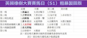 今年葉森橡樹大賽,即英國橡樹大賽,古摩亞的氣勢竟然是被高仕登父子壓著,也許在約克一戰並未派出最強的馬匹。賽事可以先刪「詠佳月」、「南之端」上戰表現平平的馬匹。「淘氣千禧」雖然上戰贏馬,但是本身馬匹預計並沒有參戰計劃。估計在賽事中會稍為跟前,因為岳伯仁一定會派「六月相思」去領放,說不定想利用「上流貴婦」搶口的缺點。但是「上流貴婦」並不容易應付,除了在今年復出大勝九乘外,還在三級賽慕絲多拉錦標跑季軍,在血統上來說,並無根據不合跑長途,只要跑回正常水準可以勝出。「嫻雅風姿」雖然在之前的表列賽大敗,不過上戰跑回三級賽藍風錦標大勝而回,當然如果在軟地舉行表現更好,不過也應留意好地的表現並不差。我不認為「合奏交響」在哩半發揮差過「戰神日」,雖然「戰神日」早已經在愛爾蘭一千堅尼前鎖定馬匹角逐葉森堅尼大賽,但是「合奏交響」已經在2000米證明過,不要忘記母系也是葉森橡樹大賽冠軍。至於「伴月色」在一千堅尼錦標賽日的美寶莉錦標輕鬆大勝,完全沒有用過,橡樹大賽發揮較易。至於「戰神日」以及「凌雪飛」料分頭比較低,但是為了保險可作四重彩配腳。