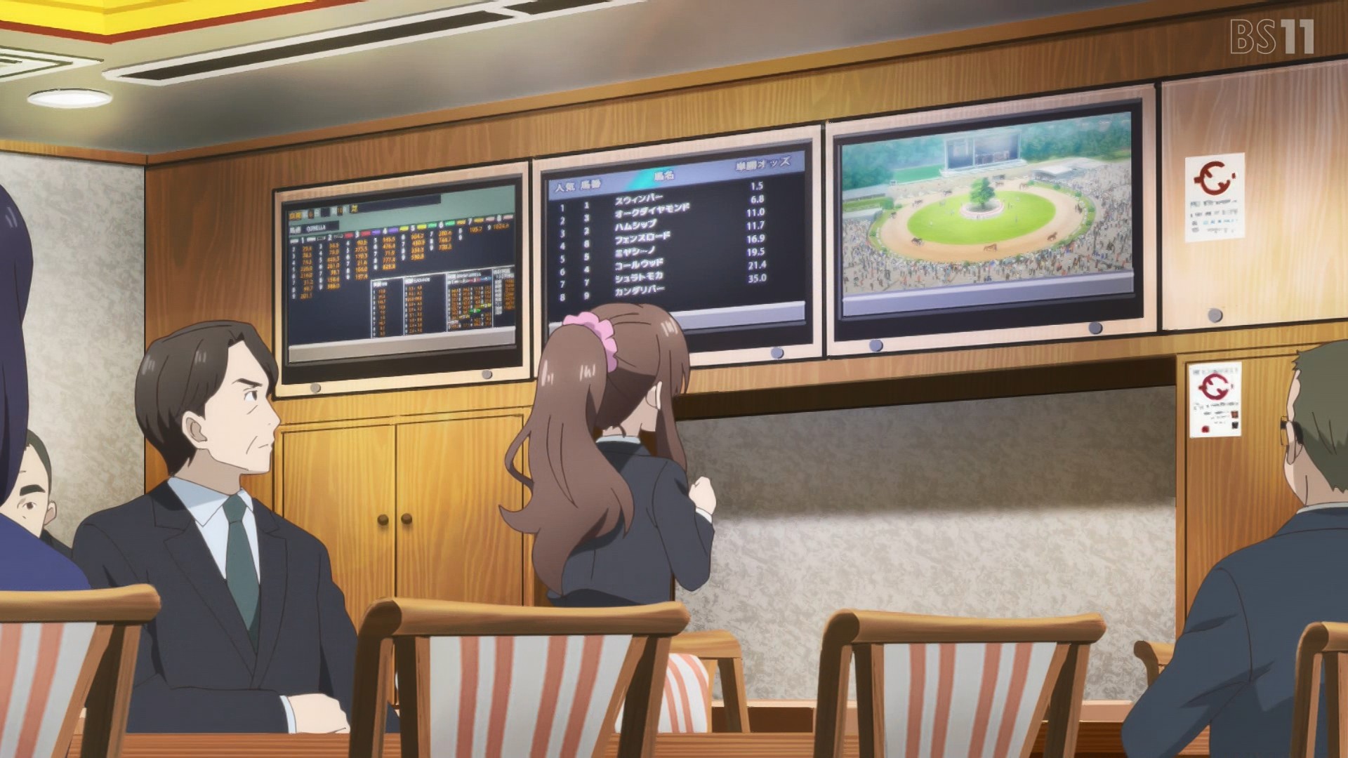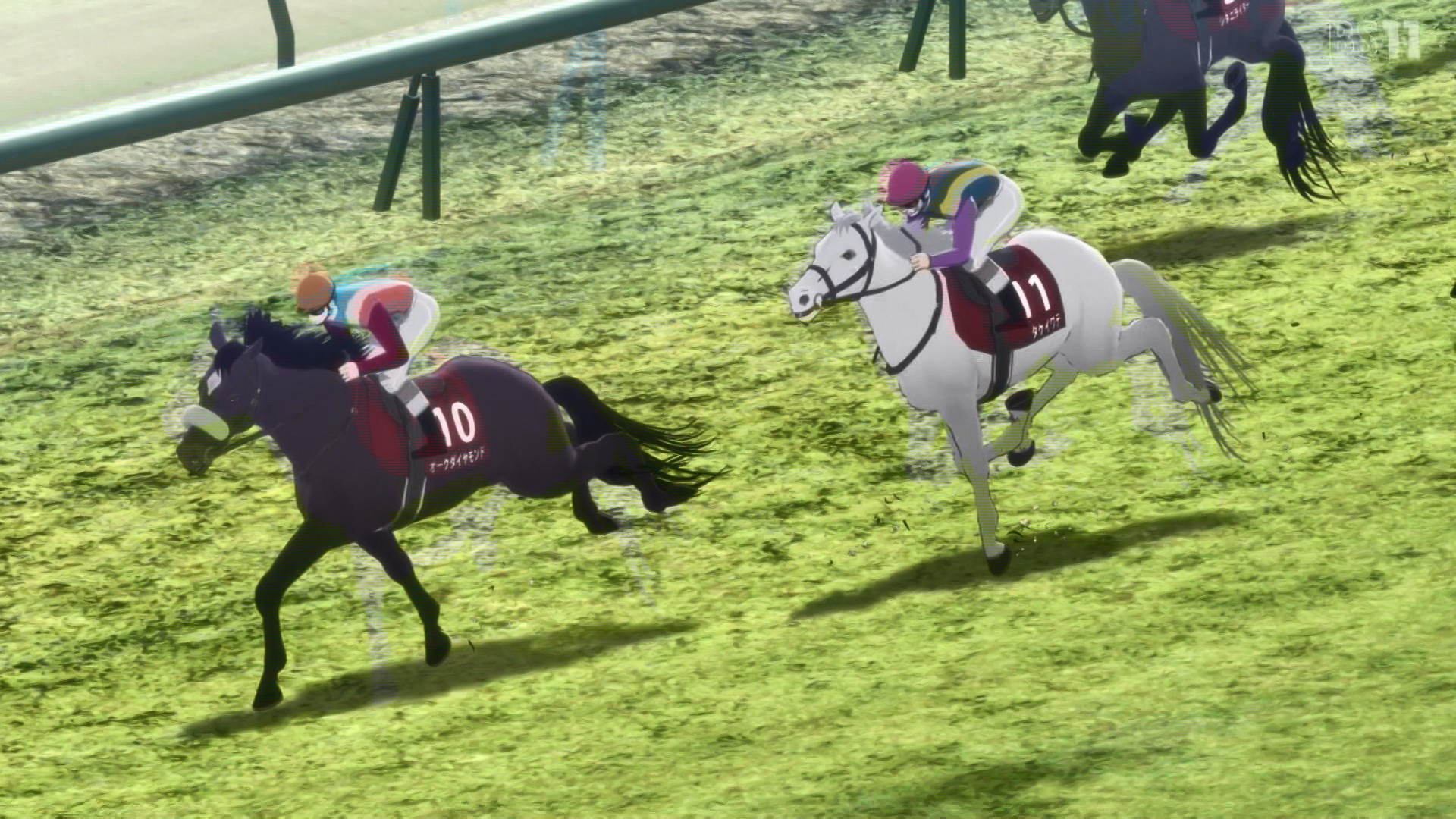 樫野未來的愛駒Oak Nature也有一定實力,不幸在阪神大賞典上陣之時,不幸骨折需要人道毀滅。結果淚崩。這一集進度只是兩個星期而已。這幾集有村優描寫內容較少,經紀公司也沒有大動作,應該會在皐月賞前提及更多內容。當然描寫外國賽事,還好作畫沒犯下日本錯誤,就是帽子的顏色不受檔位規範。