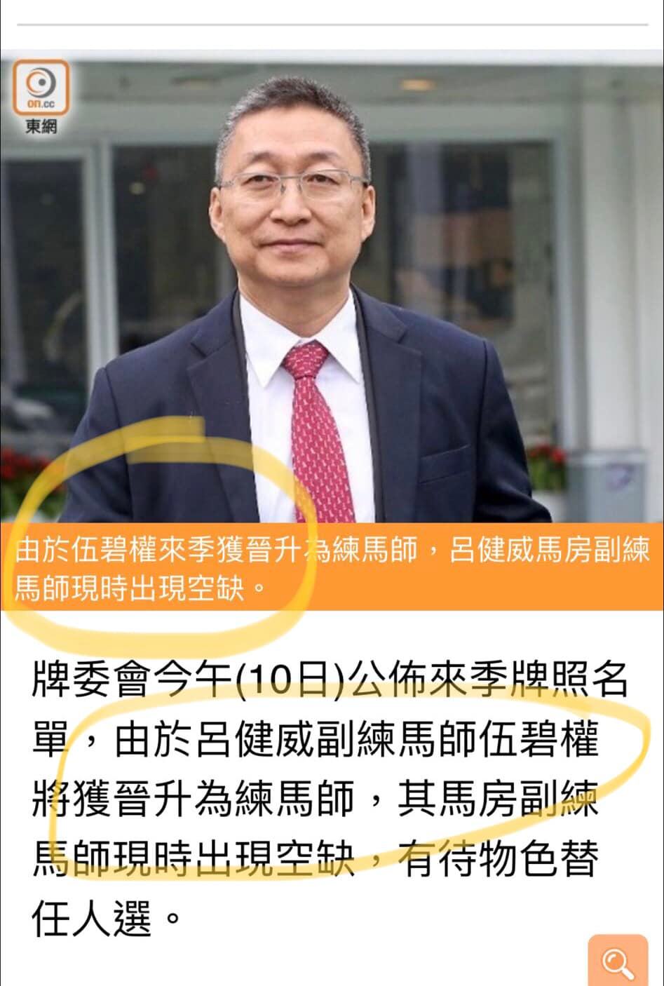 香港賽馬會上星期五召開練馬師牌照會議,宣佈由「伍碧權」獲頒發下季練馬師牌照。