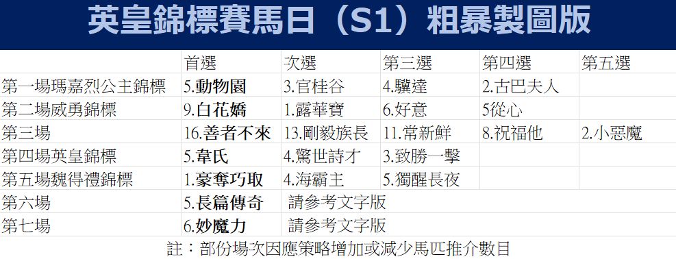 主要賽事英皇錦標。雖然出馬少,但是質量不錯,六駒參戰馬,有五匹贏過一級賽冠軍,且評分有力超過120分馬匹。不過似乎在獨贏賠率方面拉得有點大,那麼是不是英國方面過於吹噓兩匹三歲馬,還是另有目的?「韋氏」以及「上流貴婦」如果單以葉森打吡及橡樹大賽成績,假如並沒有跑出「狂新聞級」表現,牠們早已經贏了。問題只是今年的歐洲三歲馬世代水平是不是很強,到現在還沒有答案。其他四匹年長馬,除了「萬勝飛」都稍為看低。不過比較葉森打吡及橡樹大賽始終打吡較上,加上「戰神日」角逐愛爾蘭打吡時實力仍然不足。「韋氏」早已經在兩星期前是我的首選,除非賽日狀態臨時大趺,應很有機會勝出。次選會是德國馬「驚世詩才」,既然在變化地勝出凱旋門大賽,好快地呢?不要忘記也在好地有好表現。接著會是「致勝一擊」,我看到牠在外圍獨贏賠率是不是有那麼抵。坦白說馬匹有無限性能,雖然受到騎師換人影響,不過也是實力派騎師,說不定爆個冷。「萬勝飛」屬神經刀比較不穩。「波爾明」偶有表現,但一遇實力馬十之其九見底。「上流貴婦」或許不錯,但就算有戴圖理不值次熱。