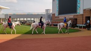 星期五函館競馬場,出現三匹白毛馬同時操練。三駒先在沙圈做運動。接著各自出操。三匹白毛馬分別是「飛雪駒」(Hayayakko、ハヤヤッコ)、Sodashi(ソダシ)以及Aoraki(アオラキ)。前兩者是分級賽冠軍,將角逐札幌紀念賽。至於Aoraki剛是兩歲處女馬。