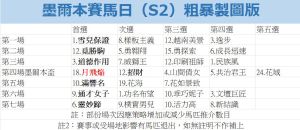 因應「月飛焰」退出賽事,不提供馬膽,當然如果你心目中想要要膽,可當第二選「招財」為首選。「招財」雖然今年跑過一次輸給「川河威駒」但可以避免重磅,聖烈治錦標中,雖然大敗,但已經做好試驗,只要跑回前場表現一場沒問題。「山間倩女」上場起步稍為慢一慢,決定留後,但結果跑獲第四名。今年秋曾擊敗「雍容爾雅」實力當然不可小看。「共治君王」賠率開出來真的不好,在考菲爾德能夠跟前下跑第五相當不錯,且可留在內檔,不需太急放,拖其一腳純粹是賠率。「花域」成功以逸待勞等待一個墨爾本盃資格,在大都會錦標跑獲第三,未從加磅懲罰從而取得較前名次,就看看這一次的方式能不能賺取一個機會。假如真的要找更穩的北半球馬,屢拼二三線中長途賽的「不戰而勝」可作配腳第五選。