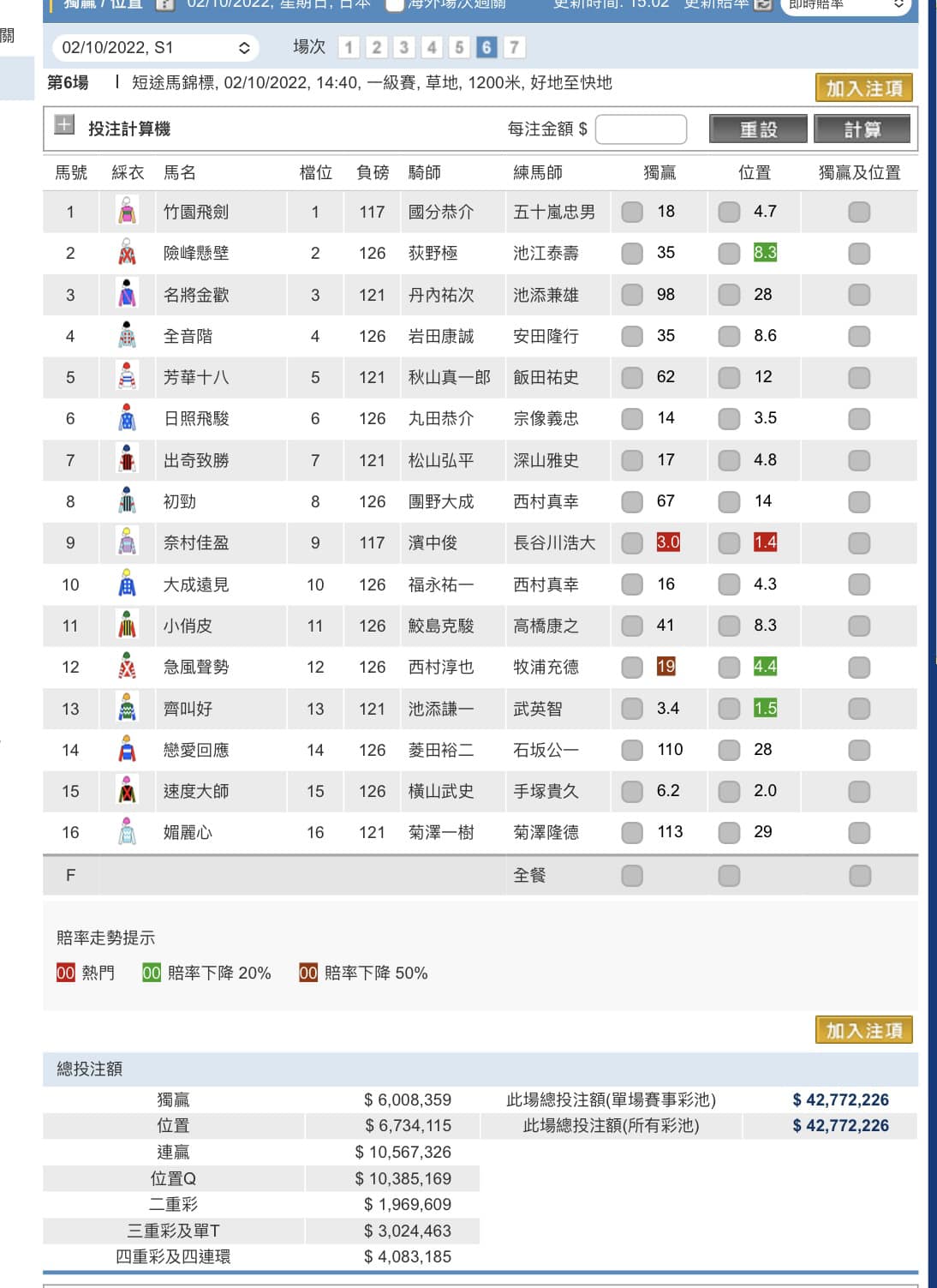10月日本短途馬錦標賽日兩場賽事出現單T及三重彩合併彩池