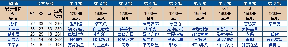 自從莫雷拉離開後,潘頓地位無人阻擋,馬季已經超過1/3,贏出70場頭馬,幫馬主贏出超過1億港紙的獎金