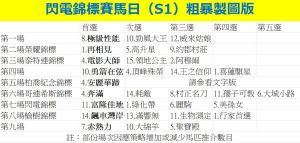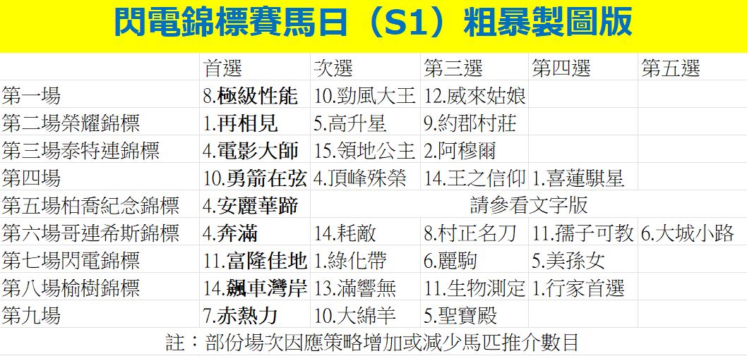 閃電錦標出馬11匹「綠化帶」保持應有水準,料在賠率上不用過熱。「勝願」跑過1200米,但在1000米首次上陣。「無出其右」在上季尾昆士蘭賽期上陣,今季在維省作賽表現不錯。「如火猛駒」近況不錯,但班底不夠。「美孫女」直路經驗似乎不多。「麗駒」有賠率可考慮冷門。「九月飛馳」只能徘徊接近位置。「非樂輕揚」連勝中止後,未知能否及時回氣。「晚上好」有進步的三歲馬或成不明物體。「妙領」兩歲時曾勝出同場同程賽事。「富隆佳地」摩亞錦標贏得出色。