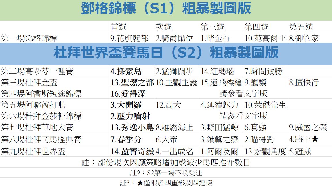 杜拜司馬經典賽,「春秋分」在當地快試,最後400米做出短途馬級別的時間,馬匹絕對有強大爆發揮,除非遇上意外,否則應可以輕鬆勝出。不過「大帝」的鬥心很強,如果面對兩馬接戰,其實並不事給任何馬匹,日本盃跑亞軍後,立即收起做法正確。「桀驁之戀」贏出育馬者盃草地大賽看似對手弱,但實際也有一定對抗力。我真的很想考慮「將王」,不過考慮應該有不少香港馬迷拖位置Q腳,變得賠率方面不值「瞄得對」在未來城草地賽顯得對賽事中渴求,哩半路程絕對有把握。「多巴先生」除非表現突飛猛進,否則機會不大。