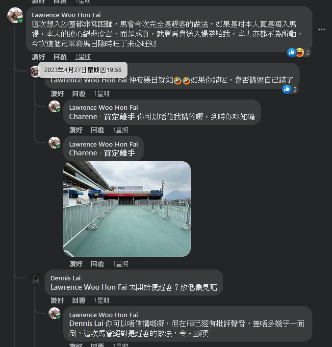 狂小編一向強調,歡迎Z世代或Y世代人士接觸賽馬,如果因為一個活動變得異常,讓普通馬迷誤以為不便,這樣才能為那些人打開賽馬之門。看看不少歌迷也有買馬以及開馬會戶口,這不是雙贏嗎?就算之後不買馬,也願意去買六合彩吧。