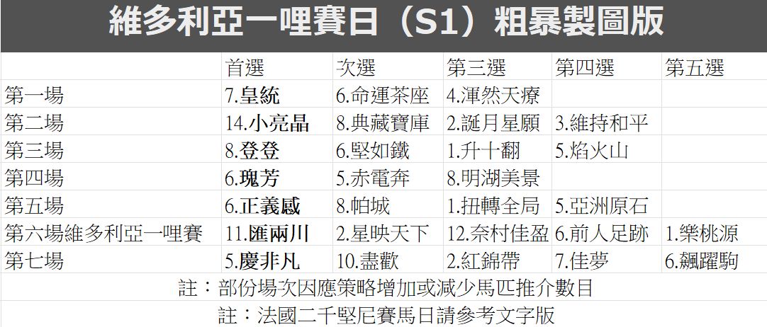 日本主題賽事維多利亞一哩賽,要擔心的是可能出現的天雨,不過雨勢沒皐月賞或NHK一哩盃時那麼強。「匯兩川」去年在變化地的女皇伊利沙伯二世盃中跑獲第五,但馬匹追勢不錯,今年在東京新聞盃中採勝更主動的跑法,結果追上一席亞軍。相信在維多利亞一哩賽發揮與一級賽實力的表現。「星映天下」在大阪盃中留得比想像中更後,結果追上亞軍,一哩合其發揮,面對雌馬可以發揮。「奈村佳盈」雖然自去年櫻花賞以來重返一哩,不過在高松宮紀念賽發揮相當出色,只是在平磅下被對手反勝。返回此程以實力可以解友。「前人足跡」去年贏出安田紀念賽,馬場合發揮,如能及時調整有機會。「樂桃源」馬匹本身合跑變化地,前年在一哩賽中上位,路程不是問題,變化地是其好處。