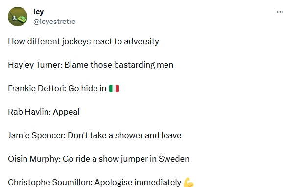 因為可能是他的最後一場頭馬。星期五及星期六葉森打吡賽期他總共有五匹座騎,全數都在大賽策騎。