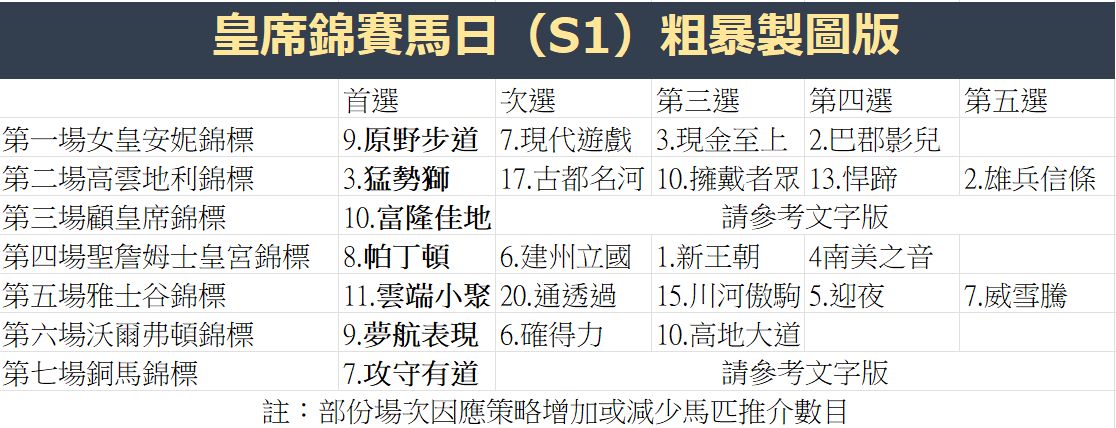 至於,九匹出賽馬當中,除了「堅不可破」見底外,其他馬匹頗有實力。個人最看好的是「帕丁頓」,在愛爾蘭二千堅尼發揮相當完美。馬匹需要的一點才能完全燃點,但現在是時候發揮。「建州立國」今場換上布宜學上陣。法國二千堅尼奪亞,實力早己在格拉咸錦標證明。「新王朝」放在第三選,原因是格拉咸錦標時未以空馬身份跑不贏「建州立國」。「南美之音」可作冷配,馬匹不論在英愛二千堅尼中表現穩定