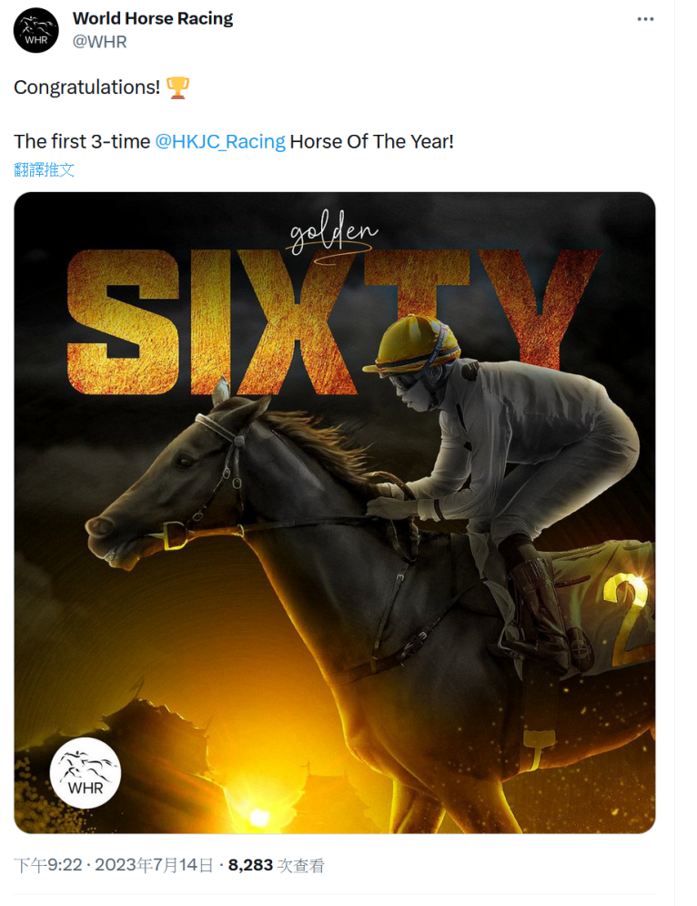 由前古活馬場主管的World Horse Racing(WHR),卻在今年冠軍人馬獎中,提時一小時宣佈「金鎗六十」為香港馬主,該文章在香港時間下午9時22分發表