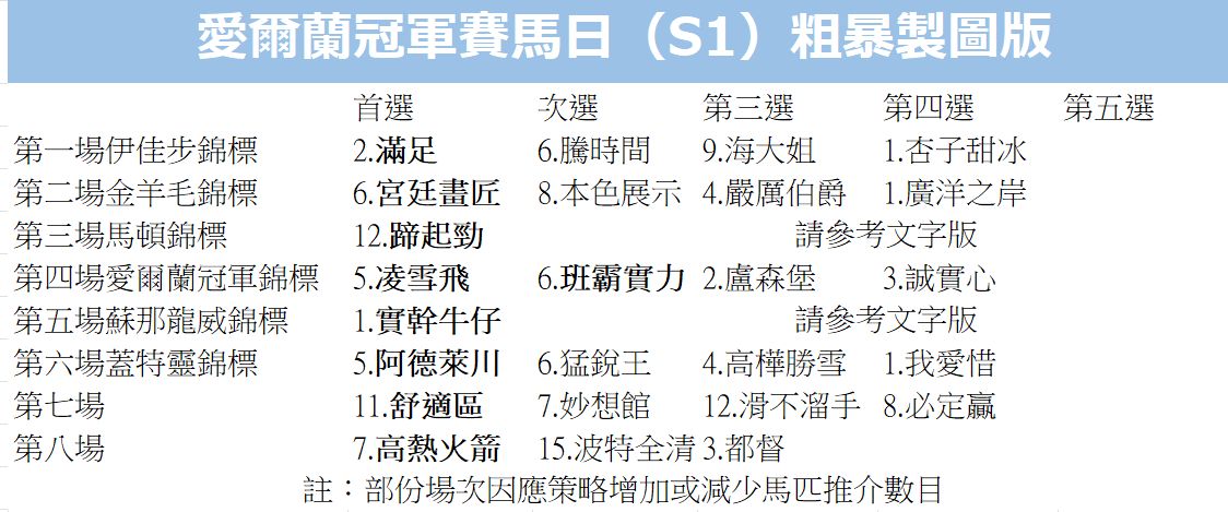 至於愛爾蘭冠軍錦標在較早場次舉行,非常平均的比賽,除了「海角遠景」以及「狂放球星」外都很有機會。其實今次「鋼鐵大王」不算太王。由哩半縮回2000米,雖然確定因今次突圍跳升距離影響。「多產巨匠」的不穩定性也是一樣,到底如何讓馬匹如常發揮也是另一個課題。